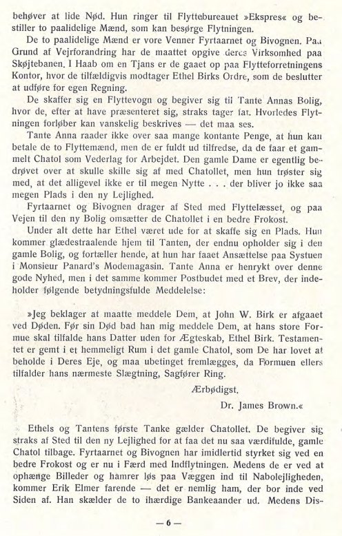 I Virkeligheden forholder det sig saaledes, at Ethels Fader, John W. Birk, der er en Fætter til Sagfører Ring, hvert Aar sender 10,000 Kr. til Datteren, men en meget stor Del af disse Beløb gaar i Sagførerens egne Lommer. Han har netop modtaget følgende meget vigtige Brev fra John W. Birk: