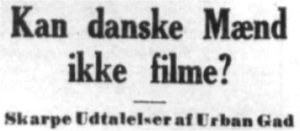I et Interview fornylig har Filmsinstruktøren, Forfatteren Urban Gad blandt andet udtalt, at medens der er faa danske unge Piger, der egner sig for Filmen, er der slet ingen unge Mænd, da disse alle er forfærdelige.