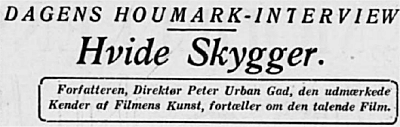 – Naa-aah, sejret, nu gør De mig helt flov. Min gode Ven fra Dreng Peter Urban Gad han satte Afgrunden, hans eget Skuespil i Scene, og med Asta Nielsen og mig, han skabte det første store Fremstød for dansk Film, og han var sød og elskelig, klog og talentfuld – dengang som nu.