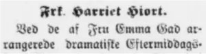 Ved de af Fru Emma Gad arrangerede dramatiske Eftermiddagsforestillinger i velgørende Øjemed i “Politiken”s Sal i København vil Frk. Harriet Hiort, Datter af Redaktør Hiort, tidligere Slagelse, optræde i 2 smaa Enakter af Julius Magnussen, “Skilsmisse” og “Naar Lænkerne rasler”.