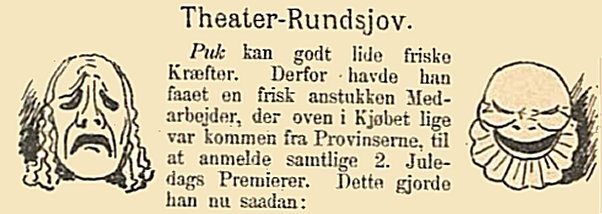 Det kgl. Theater har fejret Julen paa en værdig Maade ved at opføre »Tordenskjoid i Dynekilden« med Direktøren, Kammerherre Fallesen, i Titelrollen. Tordenskjold, der som bekjendt under Navnet Wessel har grundlagt »Hotel du Nord« og desuden drev en Tændstikfabrik, ligger udmærket for Kammerherren. Som bekjendt skyldes det et personligt Mellemværende med Marstrand, at denne og hans Meningsfæller i Borgerrepræsentationen formente Wessel at indrette noget i sin Ejendom, som vi af Hensyn til Julestemningen ikke skal komme nærmere ind paa. Dette lille historiske Træk har Forfatteren faaet ypperlig frem; der er netop i Replikkerne det forpinte og nagende, som man kan tænke sig der maa komme i en saadan Situation.