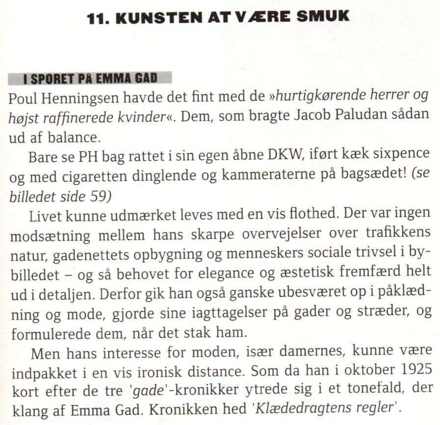 Gregers Dirckinck-Holmfeld har set på Poul Henningsens avisartikler på Ekstra Bladet. Selv om bogen på ingen måde handler om Emma Gad, virker det som om Gregers Dirckinck-Holmfeld meget gerne vil have hende med, og det får han så held til. En klang på ren Emma Gad vis.