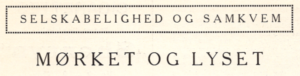 Alligevel, noget i den Retning er det vel, at vi er undergivne, ja, ogsaa vi. Selv for dem, der ikke føler noget ved det Aandens og Hjertets Lys, der tændes Juleaften, fejres vist alligevel i alle Sind en Lysets Fest rent bogstaveligt set, fordi man trænger til det. Lysene tindrer i Mørket fra det tændte Juletræ, fra Kirkernes aabne Døre, fra de illuminerede Butiksvinduer, fra de festlige Prismekroner i Hjemmene som en Forjættelse om, at Lyset vil sejre over Mørket og Solen atter straale og varme ad Aare.