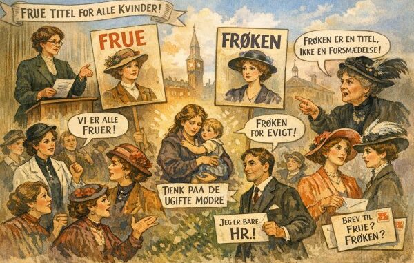 I vore forskellige Kvindeblade har der i den seneste Tid været ført en Debat om et Spørgsmaal, som har Interesse ogsaa ud over de kvindesagsinteresserede Damers Kredse, nemlig om Kvinders Titulatur som Frue og Frøken. Diskussionen er rejst af den højtbegavede finske Dr. phil. Maikki Friberg, som energisk kæmper for, at Fruetitlen skal anvendes over hele linien lige fra den Alder, hvor man overhovedet kan gøre Krav paa en Titulatur.