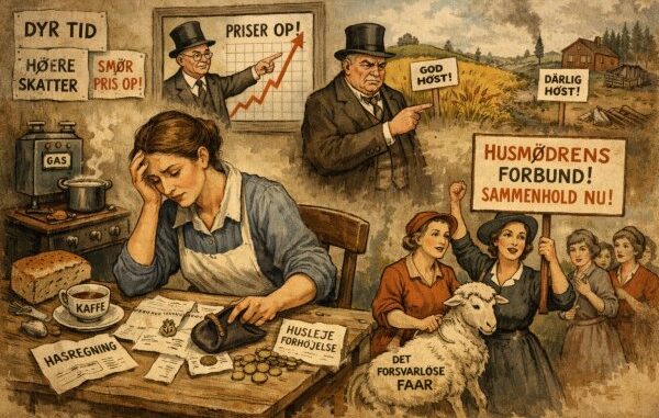Er der nogen, der nu for Tiden er ilde stedt, saa er det en Husmoder med knappe og faste Husholdningspenge og med mange sultne Munde at føde, ja, disse arme Titusinder af Husmødre, gift med Embeds- og Bestillingsmænd, Arbejdere og Kontorfolk paa faste Lønninger. Al Ting bliver sat op i Pris – undtagen netop Mandens Gage eller Lønning – tværtimod, han faar mindre, fordi Skattebyrden stiger med lige saa rivende Fart som alt det andet. Konen kan altsaa ikke faa mere – det er udelukket. Hun maa og skal med de samme Penge som for fem eller ti Aar siden skaffe de samme Maaltider, der nu koster det dobbelte, skaffe dem alle Ugens eller Maanedens Dage til dem, der er betroede til hendes Forsorg – ikke alene Maden, men alle en Husholdnings andre utallige Fornødenheder. Og hvad bryder de Unge, der sidder om hendes Bord, sig om, at Tingene er blevne dyrere – de ser kun med lidt sure Miner, at Middagen er sløj. Maaske de har Ret! I hvert Fald vil vor Tids lidt kæphøje Ungdom hævde den Teori, at det næste Slægtled har Ret til at kræve alt fordi det ikke har bedt om Lov til at blive født hos Finansministeren og de andre dyre Herrer, der piller Paalæget af Børnenes Skolemad.