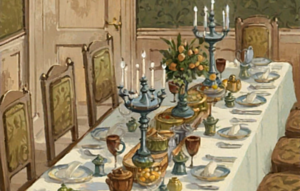 Forfatterinden har vist ikke gjort sig ganske klart, at den samme Forskel, som er til Stede mellem en rigt eller smagfuld klædt Kvinde og en oppyntet Dame, lige saa vel findes mellem den enkle Borddækning og de mange Krusseduller, hun og hendes Kolleger i Serverings-Literaturen tilraader naive Samtidige. Intet er smukkere og festligere i Hjemmet end det dækkede Bord, der staar rede til at modtage Husets Venner, men den, der har gæstet et skønhedselskende Hjem, vil vide, med hvor enkle Midler – kostbare eller tarvelige – det smukkeste Indtryk frembringes. Selvfølgelig – Guldbronce og gammelt Krystal, Druer og tunge Roser er det rigeste, for ikke at tale om Familie-Sølvtøj, men det behøves ikke – blot en køntformet Vidjekurv med Aarstidens Frugt, nogle Lerskaale i fine Farver, et Par Blomster i et Glas paa en hvid Dug kan være indtagende smukt, derimod aldrig Kallaer udskaarne af Kaalrabi, Servietter som “tyske Kroner”, Smør som Fuchsiablomster og Duge ophæftede med Sløjfer i Hjørnerne. Eller de Vaser i Etager, som Billederne overalt viser, med Radiser paa Kvisten, Smørrebrød paa første Sal og Kaviar i Stueetagen. Nationalbannere paa smaa Flagstænger mellem Fadene tør vist, æstetisk set, heller ikke anbefales – Fædrelandskærlighed er altid smuk, men behøver dog maaske ikke at serveres paa et Frokostbord.