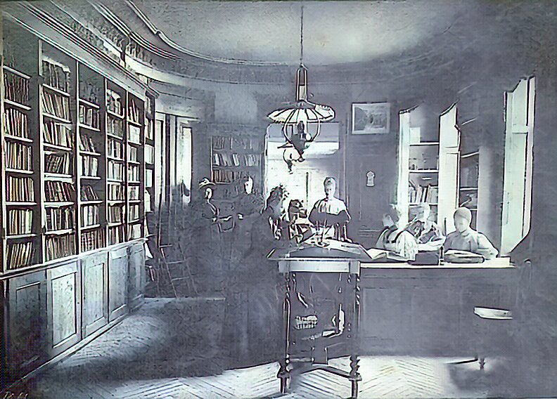 Og saa startede da Foreningen med Professorinde Klein som formand, et Medlemsantal af 72; af Bøger var der ca. 1000 men af Penge kun faa. Lokalerne var en Sal, velvilligt udlaant af Musikforeningen; senere lejedes der en Kvist paa Kongens Nytorv, hvorfra Medlemmerne kunde følge Opførelsen af det nuværende kongelige Teater.