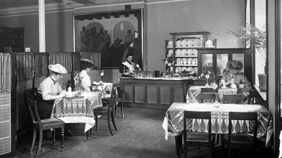 Her finder man, navnlig; om Aftenen, hvor alt er elektrisk oplyst, en hel Forsamling af tavse Kvinder, der, optaget af hver sin Lekture, er langt borte i hver sin Verden. Men det er ogsaa tilladt at tale deroppe: en smukt udstyret to Fags Konversationsstue med Billeder og Buster af Foreningens Heroer er det eneste Værelse, der vender ud til Gaden, og i Nærheden af dette, i Garderobe værelset, findes Telefonen. Endvidere er der det store Udlaansværelse, hvor de flinke kvindelige Funktionærer nu i mange Aar, raadende og vejledende, elskværdige og tjenstvillige, har gjort vort læsende Damepublikum deres Opvartning. Endelig Studereværelset med sin Haandbogsamling, hvor eksamenslæsende Damer i Aarenes Løb har udnyttet mange gode Timer, og hvor mangt et Værk af skrivende Hænder er blevet til. Foredragsaftener bliver alle disse Saloner ved Hjælp af Skydedøre gjort til én stor Hal, som kan rumme ca. 200 Tilhørere. LÆS HELE ARTIKLEN