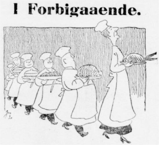 Kan man se et Billede, der sætter En i bedre Humør end disse tre elskværdige kokkeklædte Damer, hvis Dragt og Ydre henleder Tanken paa Livets muntre Øjeblikke – de faa, hvor man hengiver sig til Nydelsen af Fiskepostej med Østerssauce eller Kalkun. I gamle Dage var det utænkeligt at en Dame stod for Styret i et stort Hotelkøkken. Nu er Ligeberettigelsen trængt ind ogsaa der. Og hvor er Kvinden mere paa sin Plads end ved Madlavningen? Det hjælper ikke, at den strenge Dr. Hindhede vil henvise disse Kunstnerinder til at koge Havregrød eller Kaalrabi. Det hører Kogningens Forgaard til, og de her afbildede Damer, er for længst indtraadt i Køkkenmysteriets Allerhelligste.