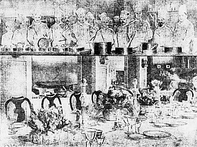 Paa een Nat har Hartmann-Jørgensen stillet Køkkenet op, og nu er Fru A. Ørnum, der i Spidsen for en Bataillon af hvide Kokke. Rund og smilende dirigerer hun Bøffen, Løgene, Kartoflerne – 5 minutter – værsgo’. Kapelmester Wilh. Schlüntz slaar Takt til “Nu skal du ha’ din varme Mad” – og er man heldig (det er hver femte), vinder man Bøffen i Tombolaen og maaske Vin til den.