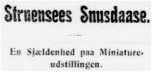 Struensees Snusdaase bliver sikkert en af de mest omtalte Stykker paa denne Udstilling. Den er udlaant af Kammerherre Münter, hvis Oldefar, Dr. Balthazar Münter, var Struensees Skriftefader i Fængselet og fik foræret af Struensee den Skildpaddes Snusdaase som Erindring om de Samtaler, der førtes mellem de to.